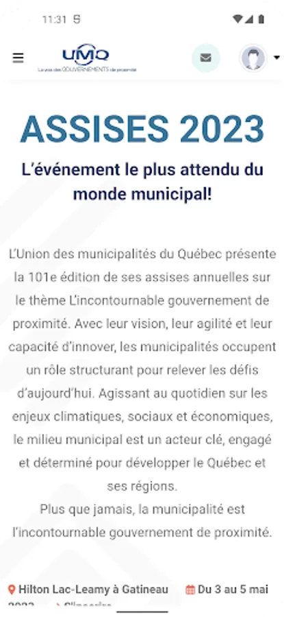 The Union des municipalités du Québec presents the 101st edition of its annual meeting on the theme The essential local government. With their vision, their agility and their ability to innovate, municipalities play a structuring role in meeting today's challenges. Acting on a daily basis on climate, social and economic issues, the municipal sector is a key player, committed and determined to develop Quebec and its regions.