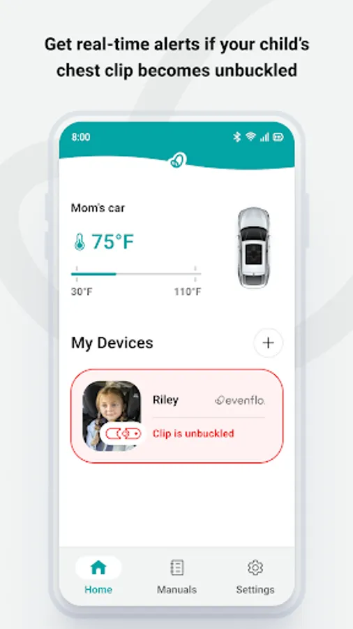 EVENFLO’S integrated SENSORSAFE technology connects your child’s EVENFLO car seat to the mobile app and alerts you to four potentially unsafe situations for your child in real time. SENSORSAFE uses a Bluetooth enabled smart chest clip to send the alerts to the mobile app. While your eyes are focused on the road, your smart SENSORSAFE-enabled car seat from EVENFLO monitors the safety of your child through these four alerts: