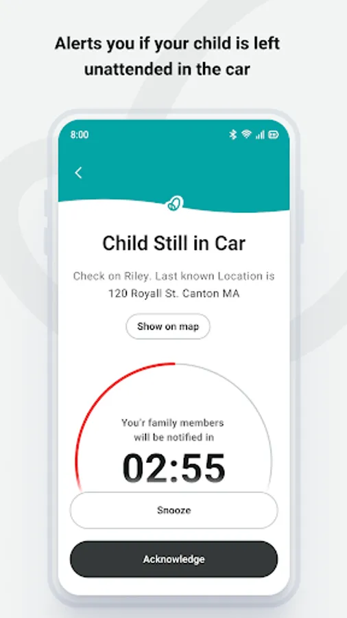 4. CHILD STILL IN CAR will alert the driver if a child has been left buckled inside a vehicle if the mobile phone has moved away from the clip. It will also alert family members with the location of the vehicle if the primary caregiver has not responded.