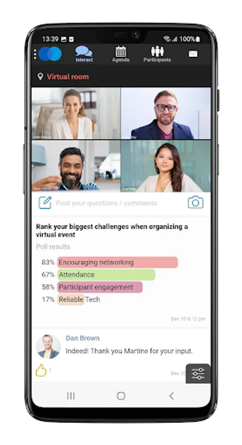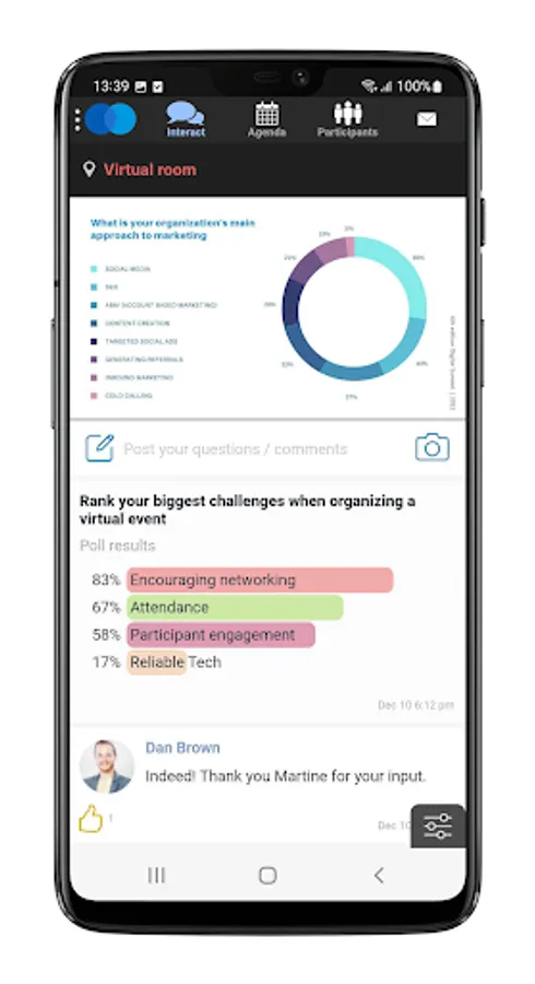-- React and interact in real time with the content and audience (polls, comments, photos, questions, likes)
