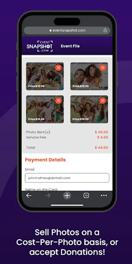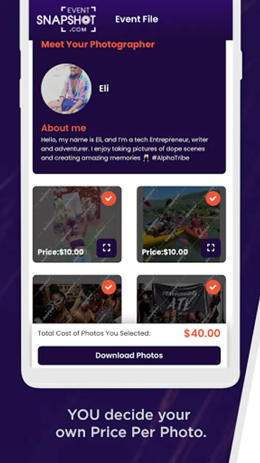 Event Snapshot is a mobile app designed for photographers to sell digital photos directly to guests at events or crowd gatherings in real-time, on a cost-per-photo basis with no upfront cost or obligation to buy.