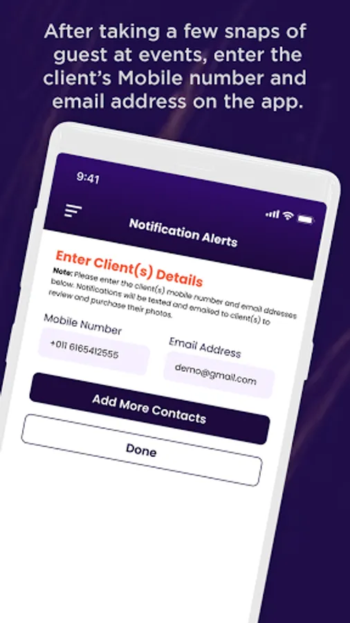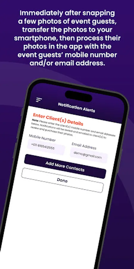 • Event Snapshot Automation System sends notification to client’s mobile number and email with photo(s) item page link.