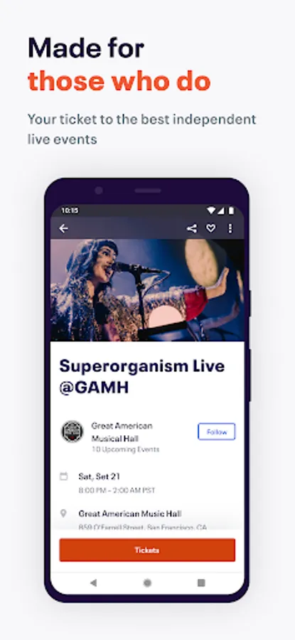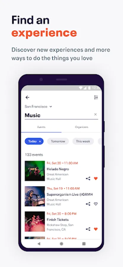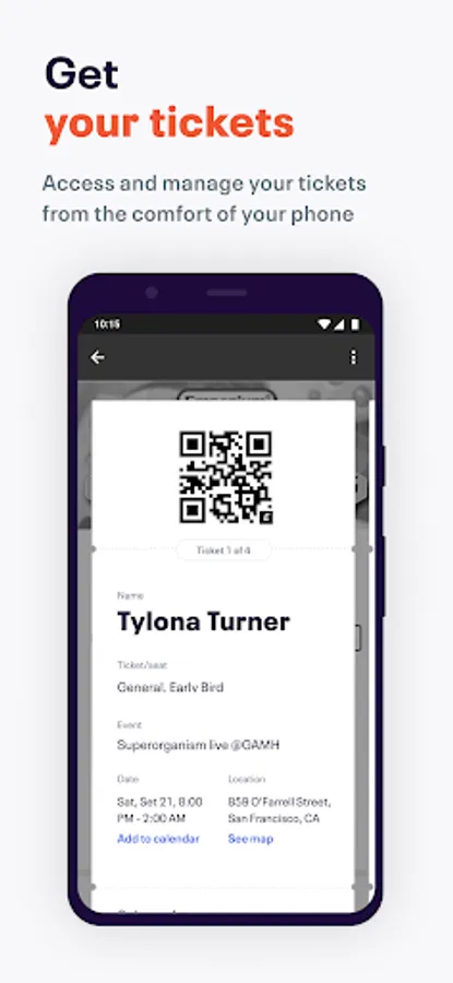 Discover upcoming events near you and get personalized recommendations. Stay up on the latest for popular events like concerts, festivals, yoga classes, holiday events on New Year’s Eve or Halloween and networking events. Find something fun to hit up by date, time and location. Buy tix and keep ‘em handy on your mobile device to make check-in nice and easy. Ready to explore?