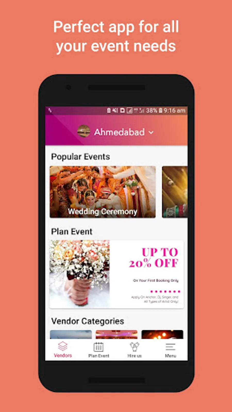 Eventendor is all you need when planning for your next Wedding event, whether it is your family function or your corporate event. Find vendors for your Wedding or Birthday events, compare their offerings and budget. Discover new event ideas and inspiration, browse through thousands of Event vendors and book meetings with them at your time. Select your preferred artists, venues, DJs and many more. Use search filters to find what you're looking for and vendor reviews to make informed choices.
