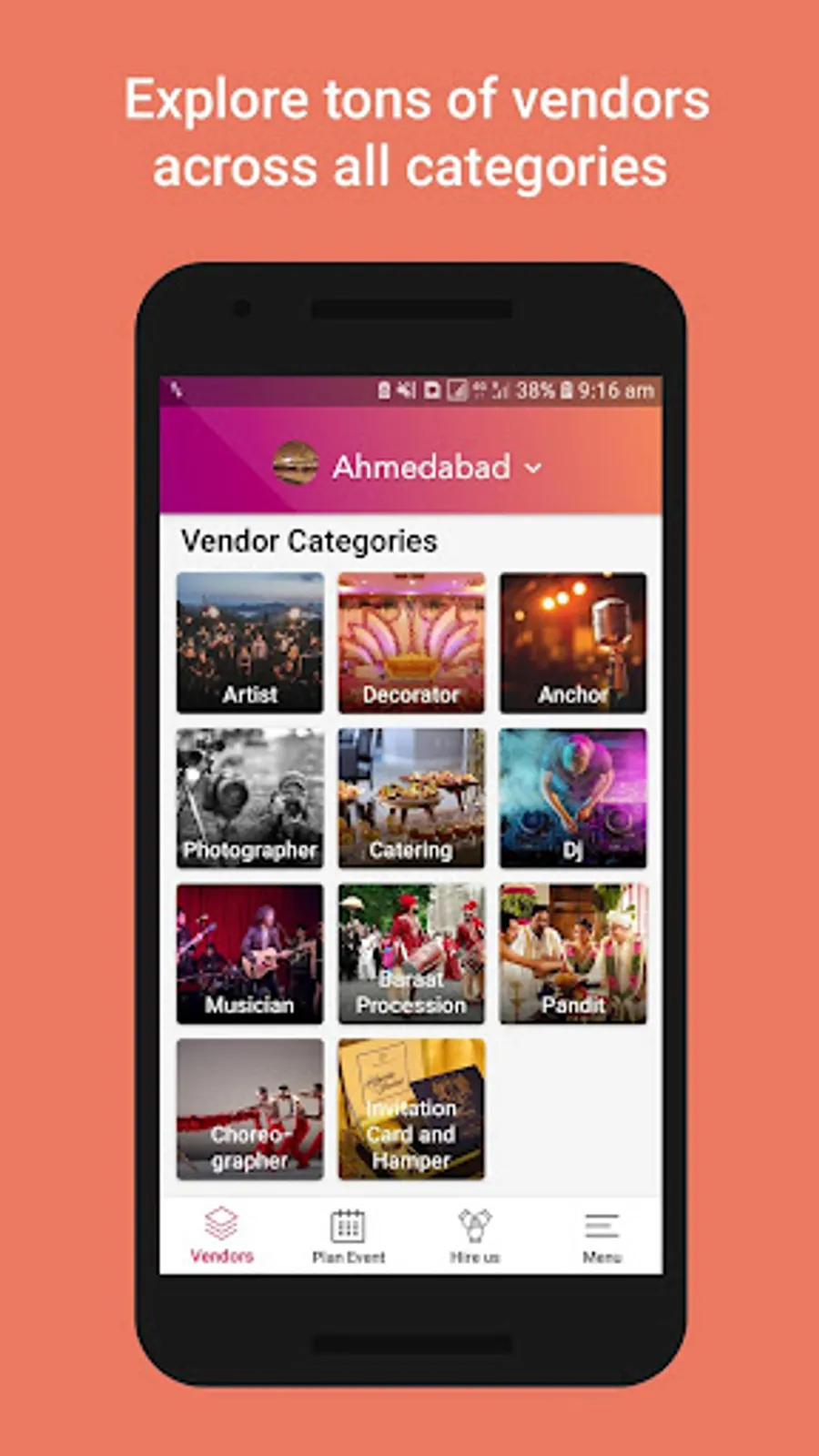 Just tell you what event you want to plan and your budget. Our team will craft multiple vendor options for you and book them for your Wedding event, Birthday Party Or any Other Event.