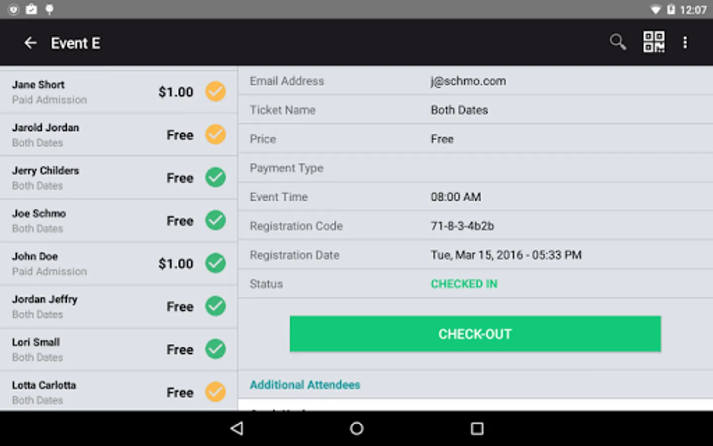 With the Event Espresso WordPress plugin and our ticketing app, you can have your own registration system to manage attendees and check them in at the door. All check-ins are synced with YOUR OWN server and you can use more than one Android or Apple device at any entry point.