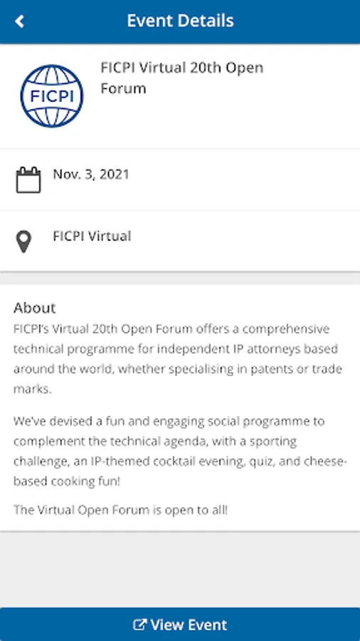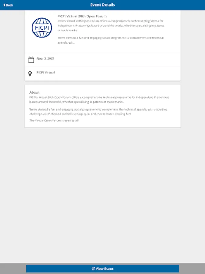 This app gives you up to date information on all FICPI events, including Congresses, ExCos and Forums. Receive updated information as it happens and have all of the latest information about our meetings at your fingertips.