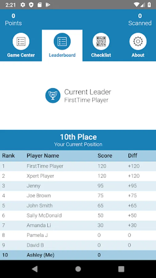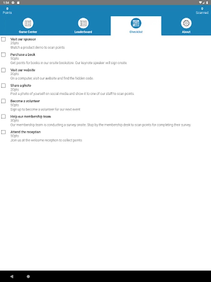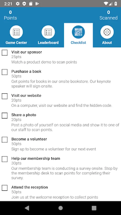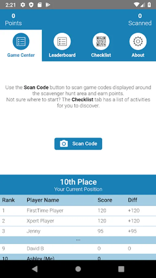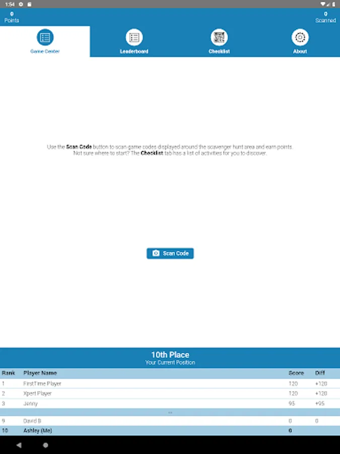 Your ScanHunt® organizer will provide you with a participation code for a specific scavenger hunt. Enter the code to load your ScanHunt® event game and start completing activities. Use the Checklist tab to see which activities you need to complete.