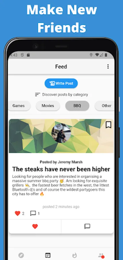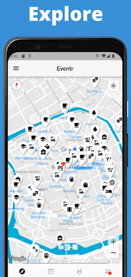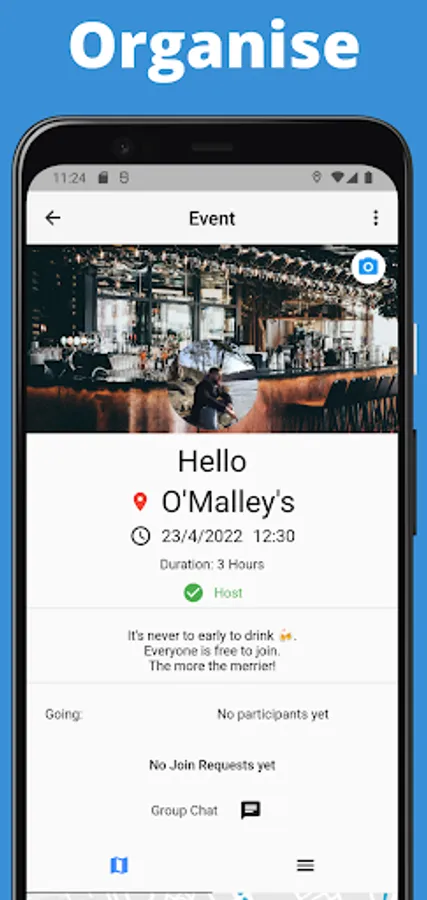 Places are shown on a map from where you can create your own events and invite people or search through the feed and join someone else's. Want to host a house party? Add your own custom place to the map and invite friends. Only those invited or going to that event will be able to see your your home location on the map!