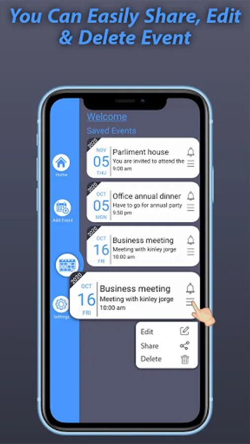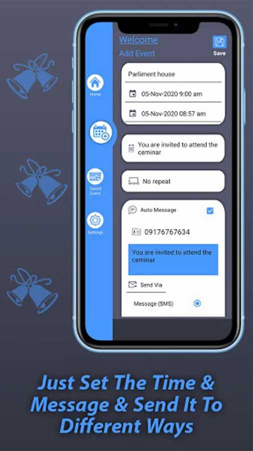The events reminder app with a customized calendar is the perfect place to create your alarms, reminders, and to-do list. The remarkable reminder app with a smooth interface makes it super easy to plan your life events, keeping you one step ahead. The Event Calendar serves as a family organizer as well as your office assistant, helping you keep a check on every important day. Stay organized with this incredible event calendar app that allows you to keep a constant check on your business schedule, upcoming agenda, family commitments, professional appointments, and every essential thing in your everyday schedule. The Event Calendar makes keeping track of every major event in your life a breeze. The app has a special feature with the reminder that will automatically send a message to your client, loved ones, or anyone you want, at your desired date and time. Even if you miss the reminder, your message will still be sent through WhatsApp, Skype or SMS.