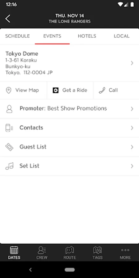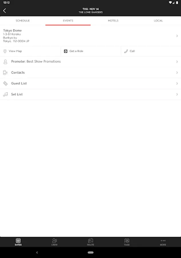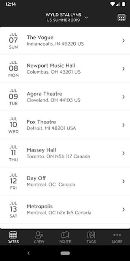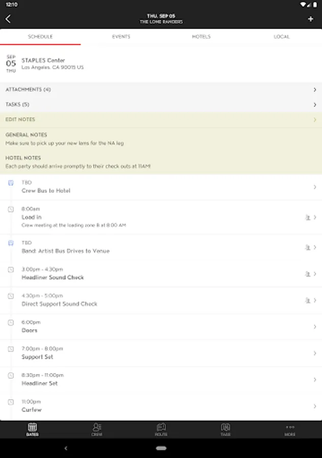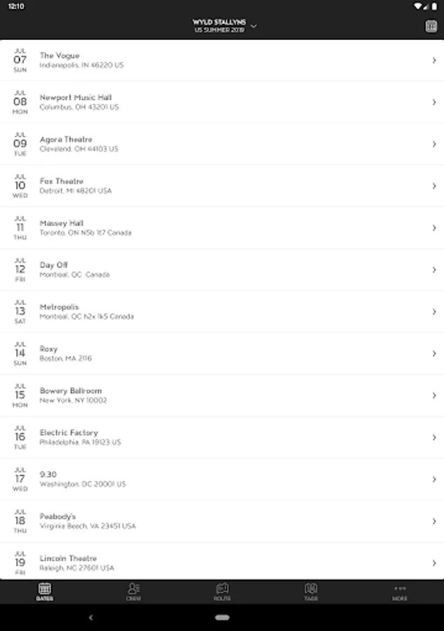 The app is designed to provide quick access to the critical information for each day. Data is stored locally for later offline access so you can avoid costly international roaming data fees. The color scheme is all black - the official color of touring bands and road cases. It can be none more black!
