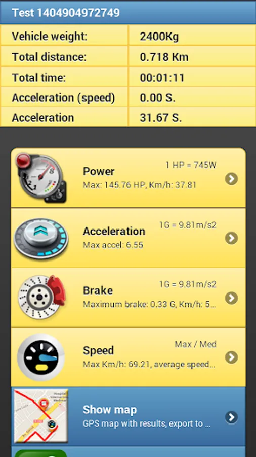 Car Performance Meter FREE is an application that makes a combined use of GPS and accelerometer to capture, store and display various physical parameters of the vehicle, car or motorcycle, such as speed, acceleration, engine output and braking force, that is, the performance of the vehicle. Also saves all data and travel route, and may be viewed later, export to gpx route or share the report of all results. Also is a speedometer.