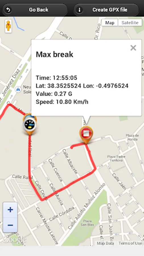 You can look on the map the route and points of the maximum values of power, speed and braking.