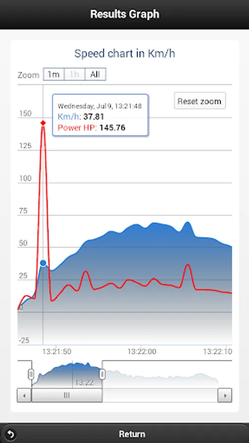 You can view graphs of all or part of the route, the values of speed, power, acceleration and braking.