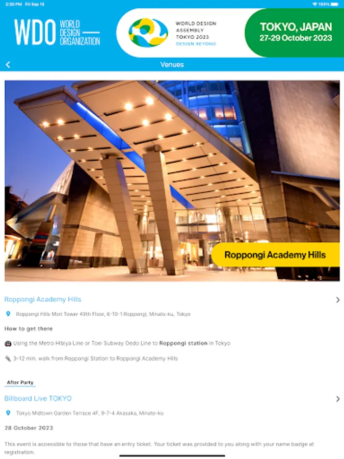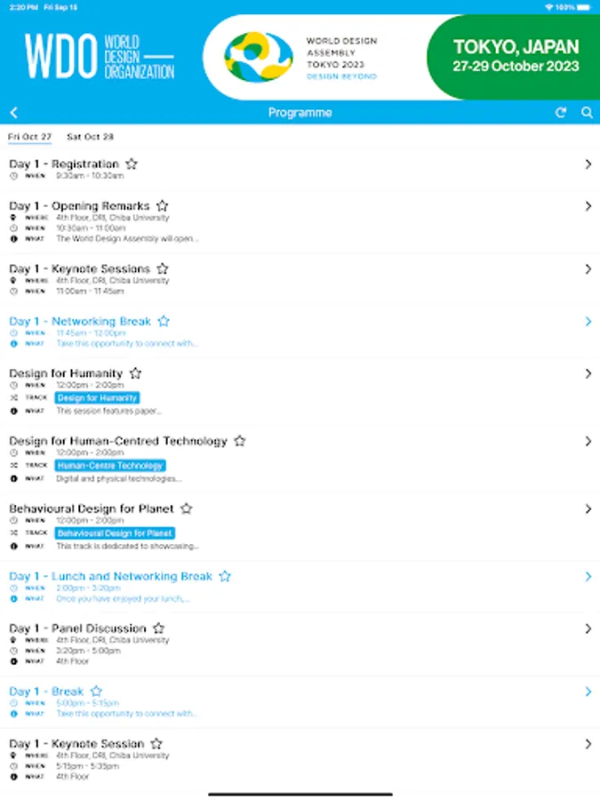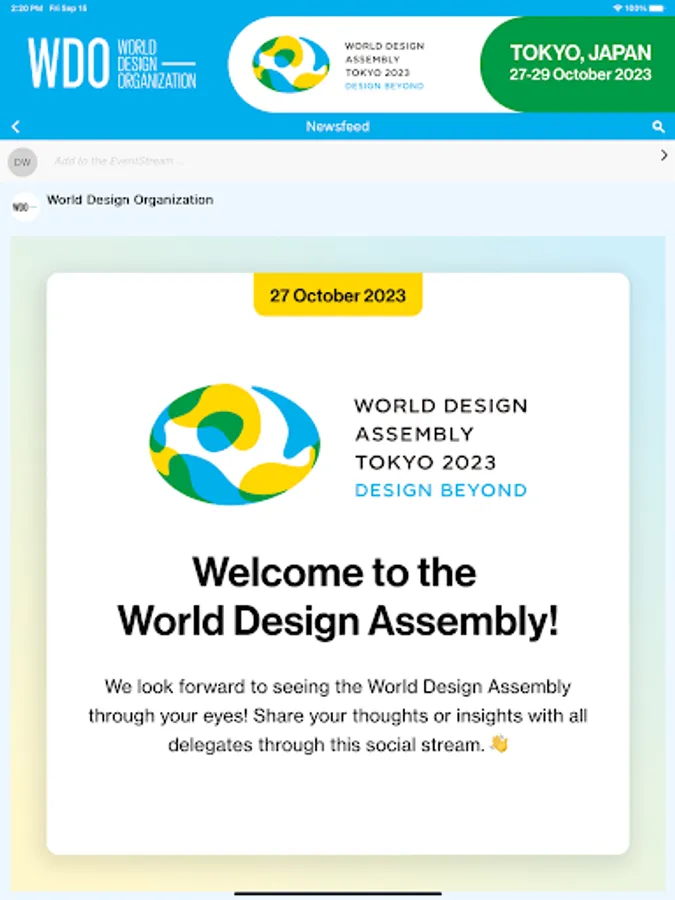 This mobile app has been specifically designed for the convenience of delegates attending the World Design Assembly, scheduled to take place from 27-29 October 2023 in Tokyo (Japan). By downloading this app, you can effortlessly craft your personalized agenda, engage in seamless communication with fellow attendees, and stay well-informed with real-time updates and essential information regarding the event.