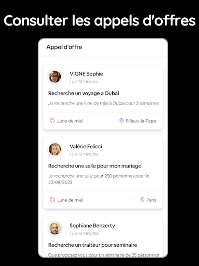 - Call for tenders: view and respond directly to calls for tenders submitted by Eventsia customers.