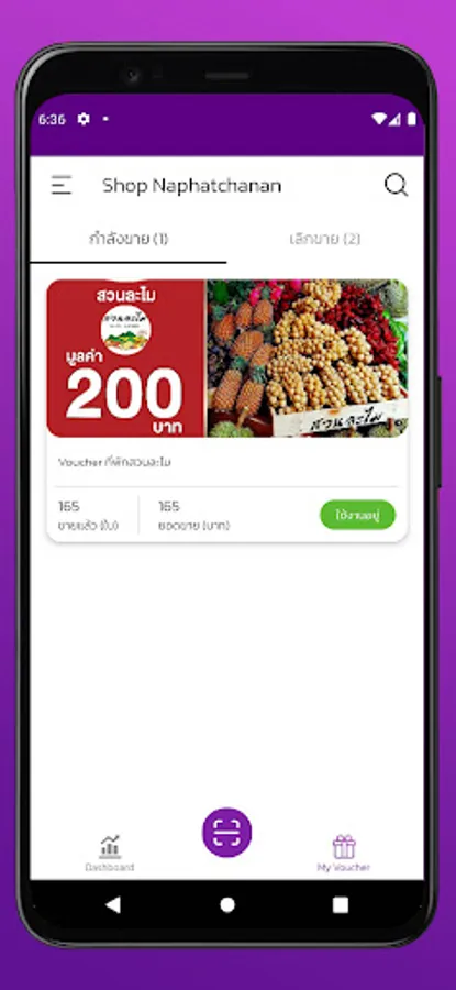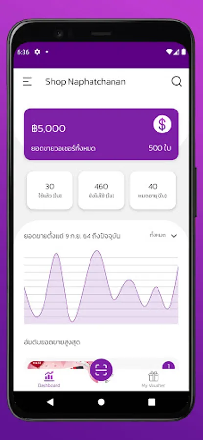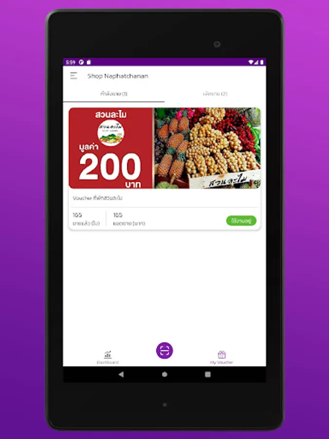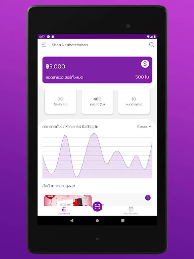 E-Voucher with main functions are scanning function (Barcode or QR code), Dashboard function for viewing sales. And statistics of voucher usage of customers and My Voucher function to view the vouchers of the currently active merchants.
