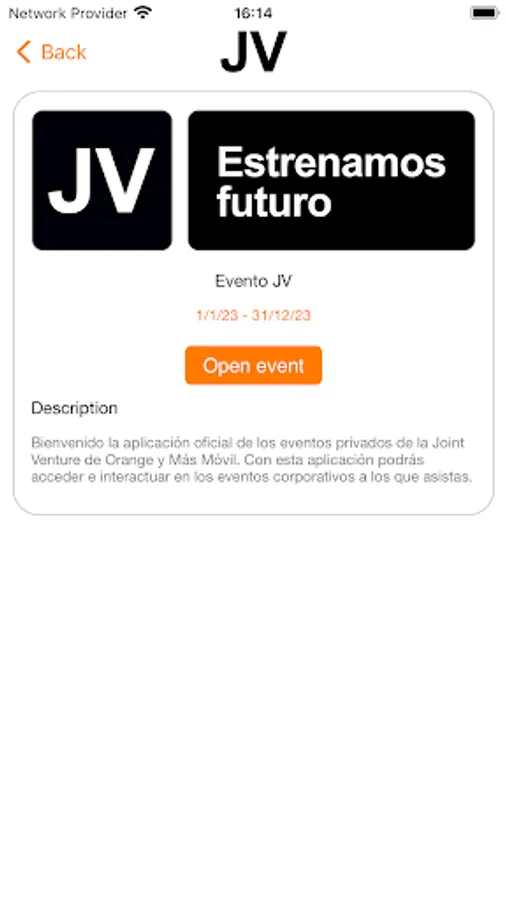 Welcome to the official application of the private events of the Joint Venture of Orange and Más Móvil. With this application you will be able to access and interact at the corporate events you attend