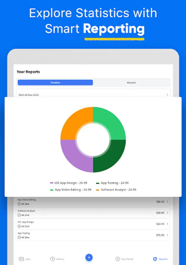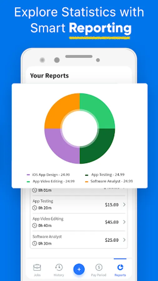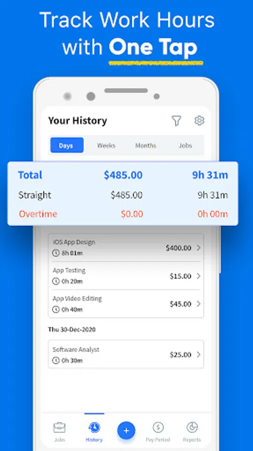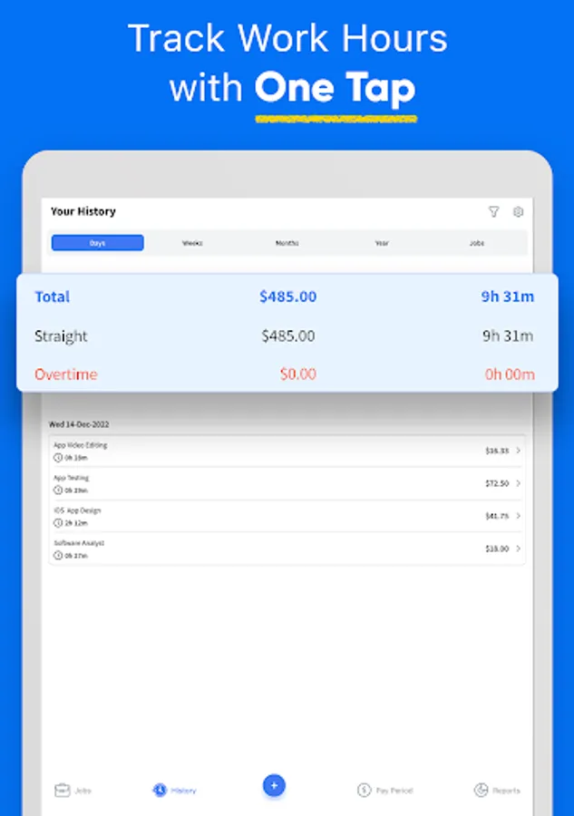 • Stay organized by keeping track of work hours and seeing reports by pay period, weekly or monthly