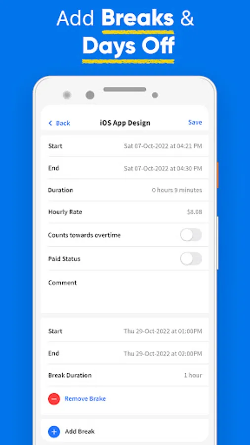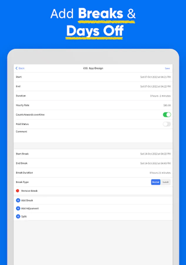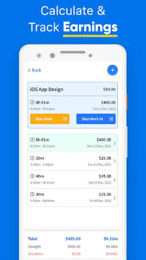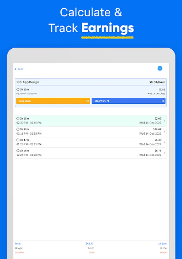 • Earn your wage, by easily keeping track of daily and overtime hours and pay