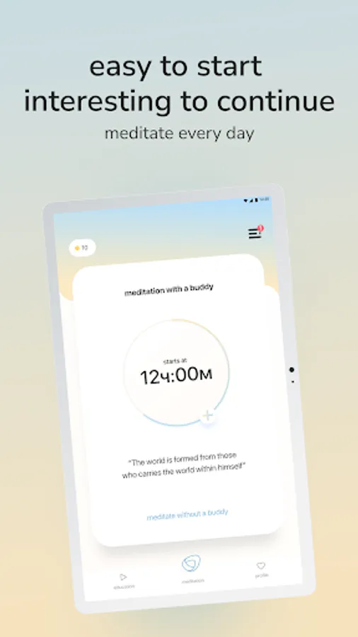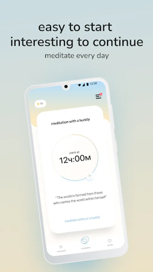 The application is as simple as possible to use, making it easy to start and interesting to continue meditating daily. It implements mechanics similar to a Tinder. You fill out a questionnaire and the application connects you with the most relevant meditation buddy at a set time every day. You can see each other, but not hear each other, as each person enters their own meditation with or without audio accompaniment.