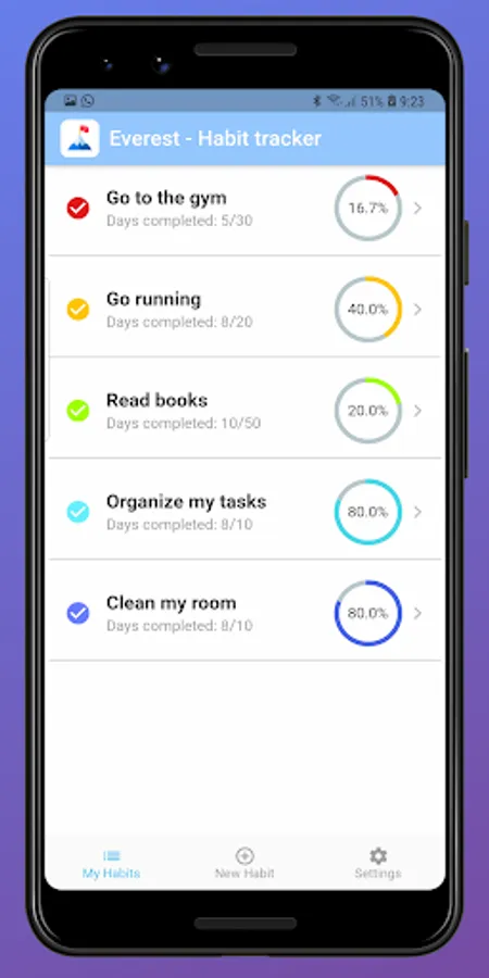 Everest habit tracker 2020 will calculate for you the percentage of the days you have completed in realtion to your habit goal. This will motivate you to accomplish with your goals.