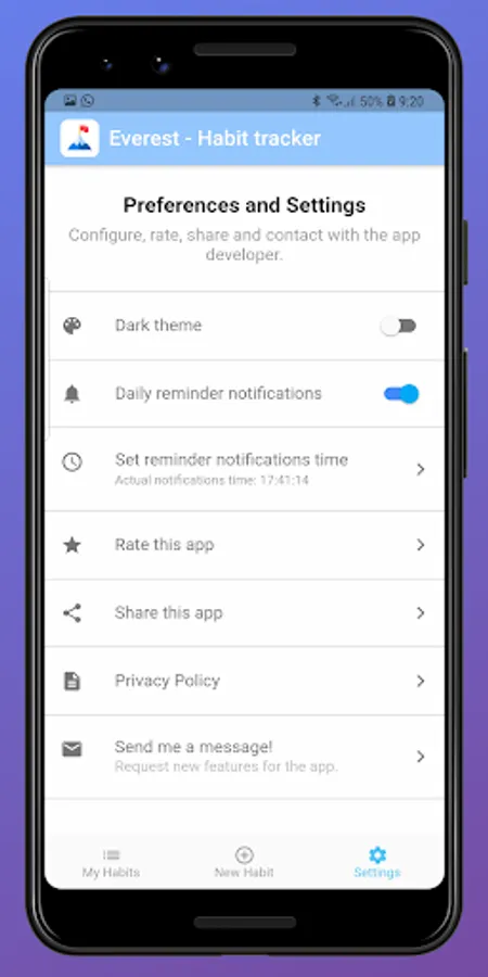 Another cool feature is a configurable notification message used as a reminder to check your habits daily.