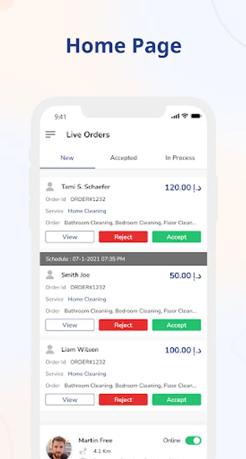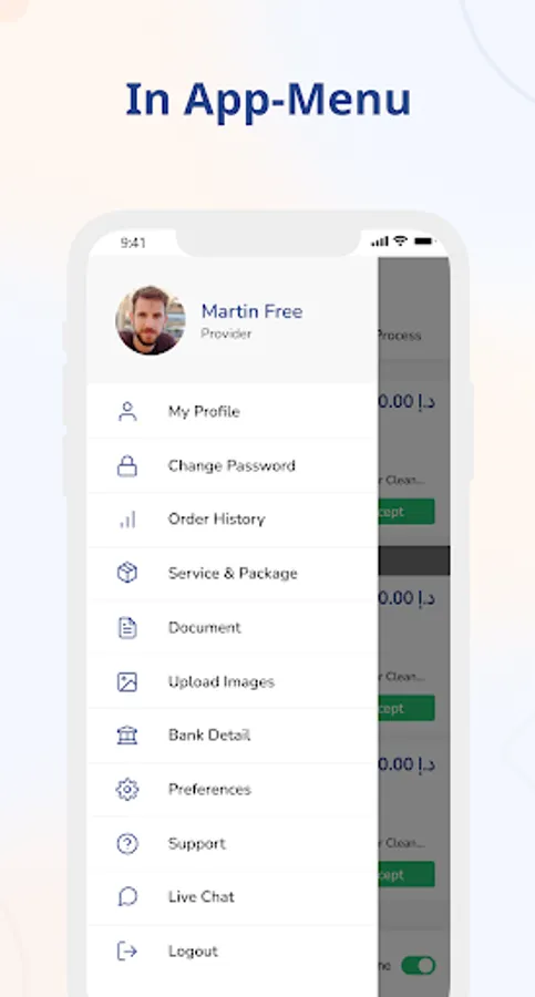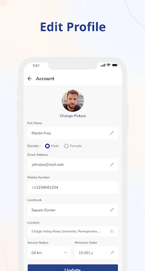 -Manage profile details such as name, email, contact, profile picture, service radius, etc