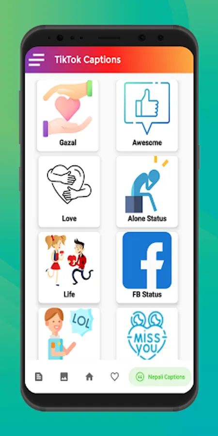 With this application, you can enjoy 10000+ Nepali Status, English Captions, Hindi Captions, Captions in different categories. You can use these captions on different social medial like Facebook, Instagram, tiktok etc, and more likes and followers or increase social media engagement.