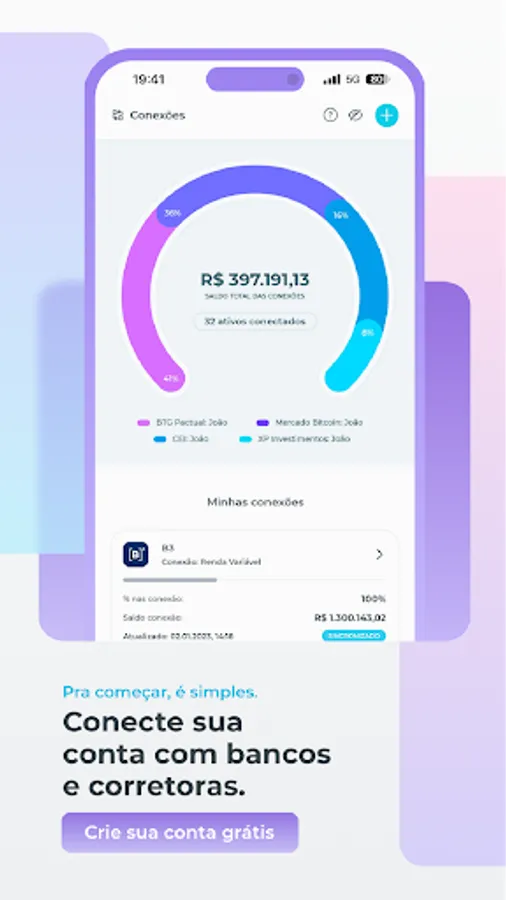 To track investments more easily, import them using the B3 (stock exchange), BTG Pactual, Itaú, XP, Órama connections, among others.