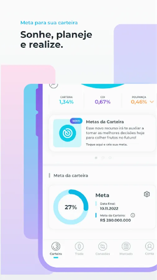 In an easy, practical and intuitive way, you can track investments in one place, organize them into multiple portfolios by strategies or objectives, set goals, see profitability, compare them to benchmarks and analyze every detail of fixed income and variable income with unique tools.