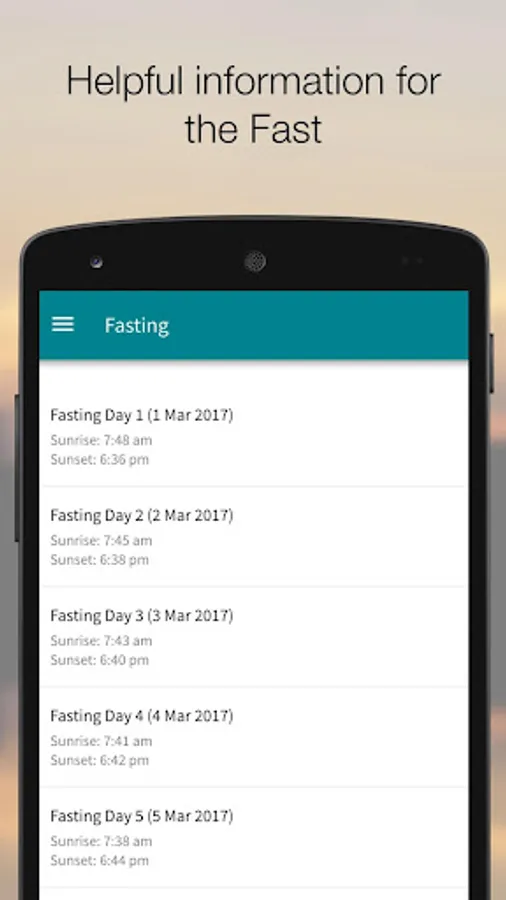 - Fasting view that shows the date along with the Sunrise and Sunset times for each day of the Fast