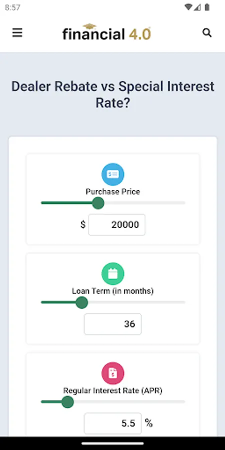 • Financial calculators to help you answer a variety of financial questions, such as how much interest you will save on a loan, or how long it will take you to pay off your credit card
