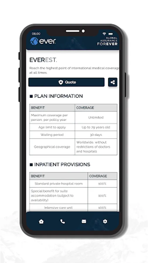 MyInsurace by Ever is a complete and reliable mobile application that gives you instant access to quotes for our health insurance plans, detailed health benefits, and the ability to contact us by phone or email. Designed to provide you with comfort and facilitate the process of quoting our health insurance plans, this application is your best ally to protect your well-being and that of your loved ones.