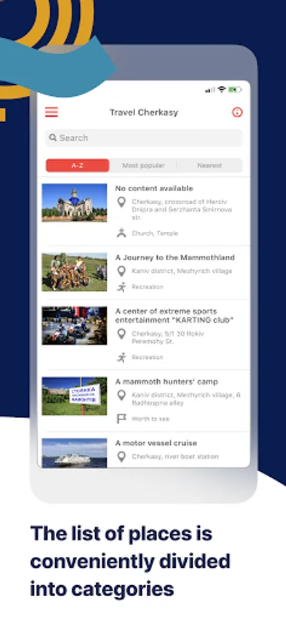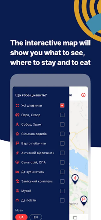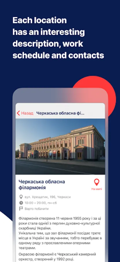 This mobile application will help every tourist discover Cherkasy region any time and season of the year. You will be able to find tourist locations and landmarks; where to eat, to stay, to have rest, to go shopping and to “recharge your batteries”. Besides this, in this application it is possible to choose a tourist route depending on your interests and preferences.