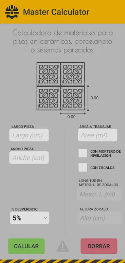 Support application to calculate materials for floors and tile coverings (Ceramic, Porcelain, etc...).