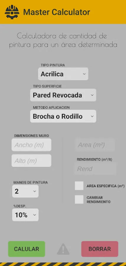 Application that allows us to calculate the amount of paint for a given area, taking into account the surface, type of paint and application method.