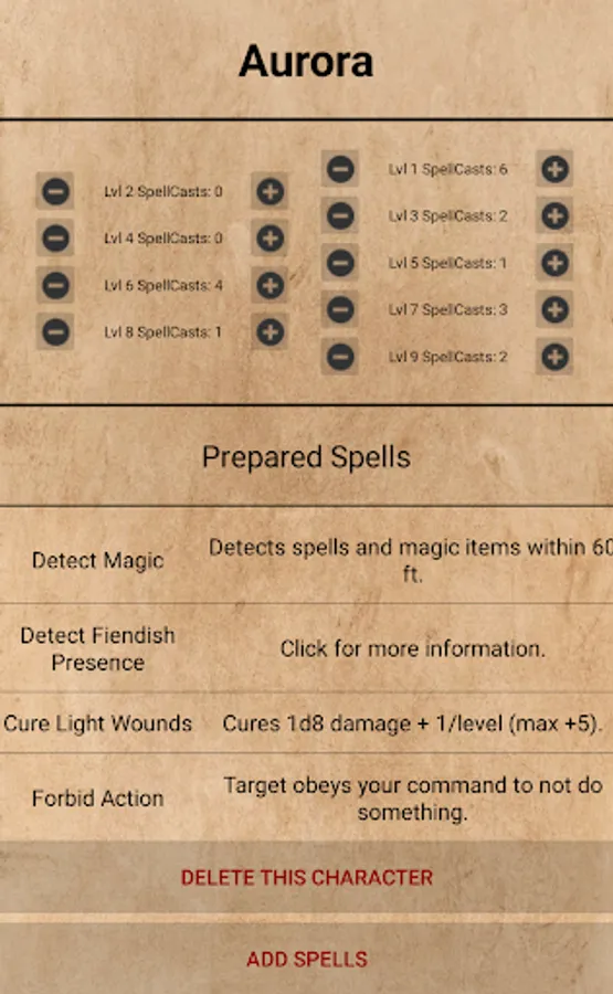 Additionally, Spell Tracker for Pathfinder allows for easy management of your character's prepared spells. Simply create a character and add the spells you have prepared for the day via the Character Page.