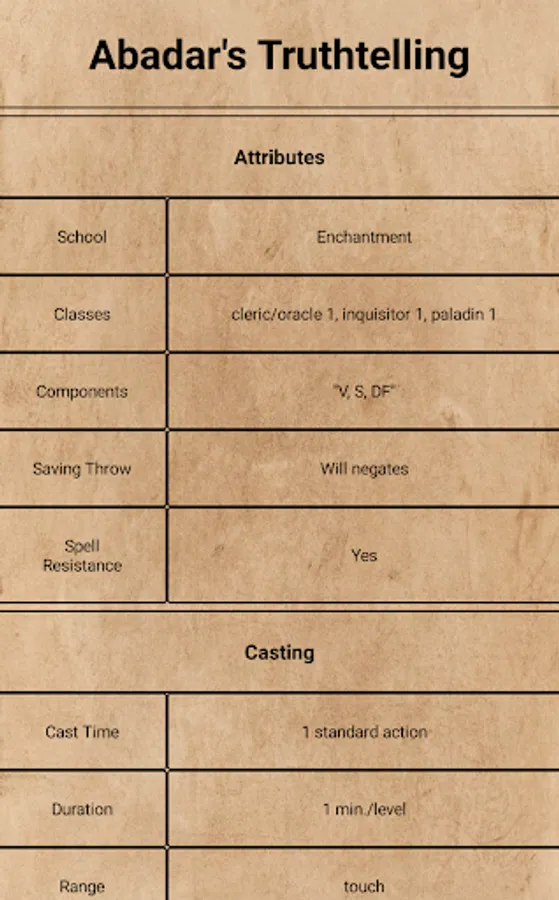 Spell Tracker for Pathfinder is the quick and simple way to lookup any spell within the popular role-playing game Pathfinder. This app supports class and spell level filtering. Each spell contains information regarding which classes can use the spell, casting, cast time, duration, a full description of the spell, and much more.