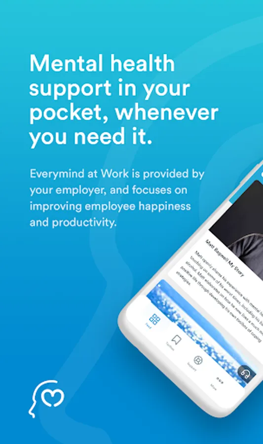 Mental health support in your pocket, whenever you need it. Everymind at Work is provided by your employer, and focuses on improving employee happiness and productivity. Unlike other apps, we take an individual approach to mental health support rather than a one size fits all approach. Tailoring content and support to your needs.