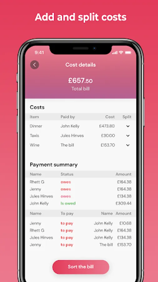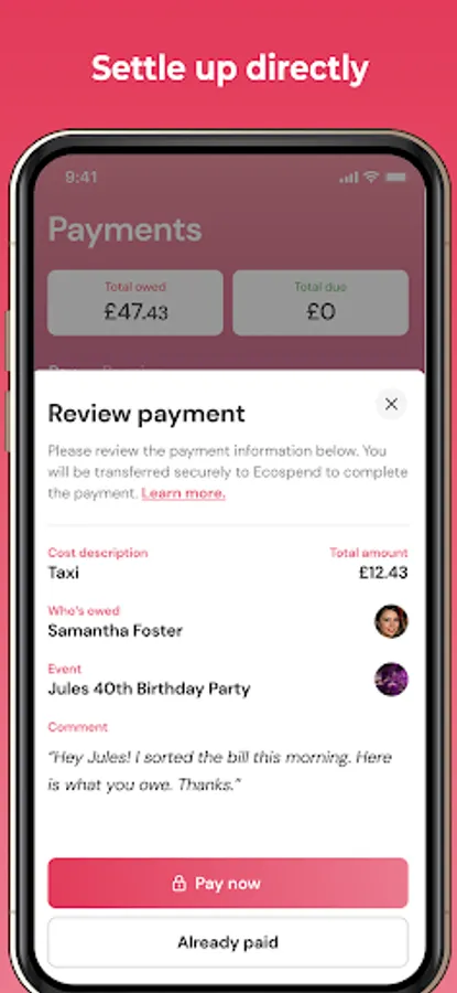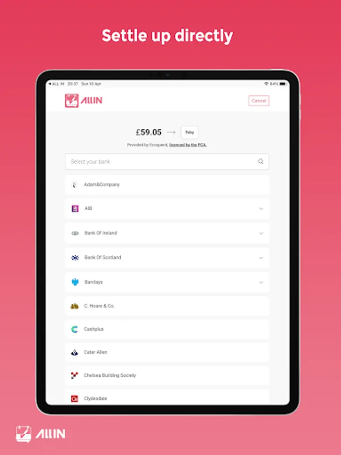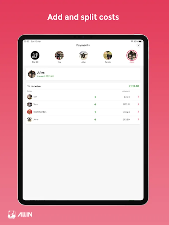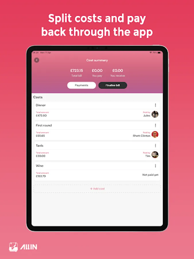 6. Let ALL IN work out the cost split and settle up payments in person or pay through the app.