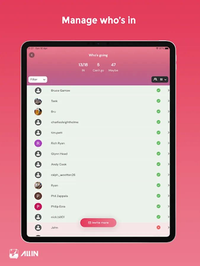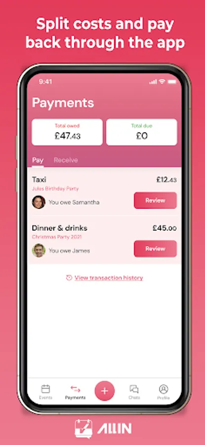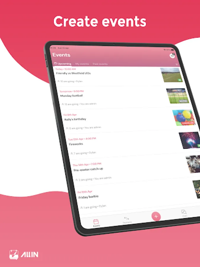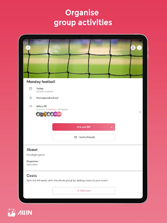 ALL IN is designed to help everyone get together with their friends, sports teams and clubs and manage all the costs and payments so you can avoid falling out when it comes to chasing up what you are owed.