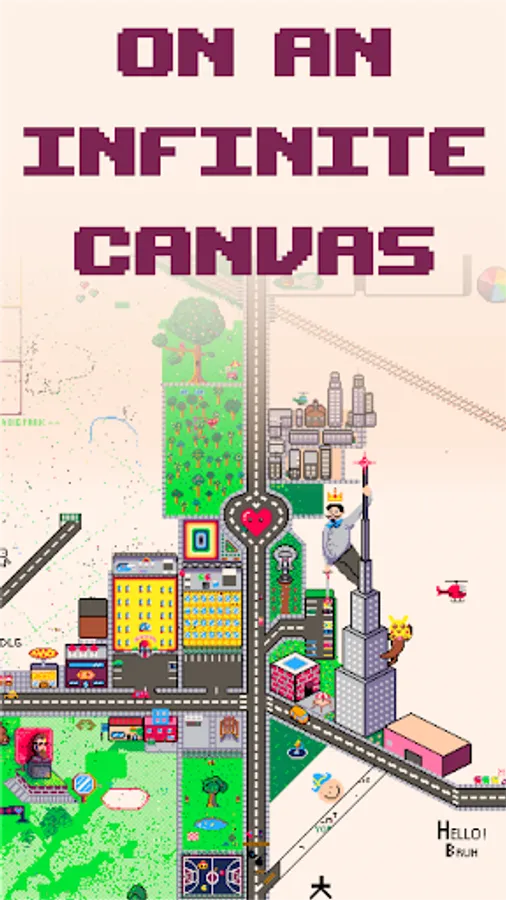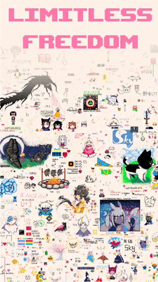 Unlike other pixel art drawing apps, Everyone Draw has no limits! Zoom out and pan as far as you want in any direction on this vast, limitless canvas. Youโll stumble upon thousands of other drawings along the way.