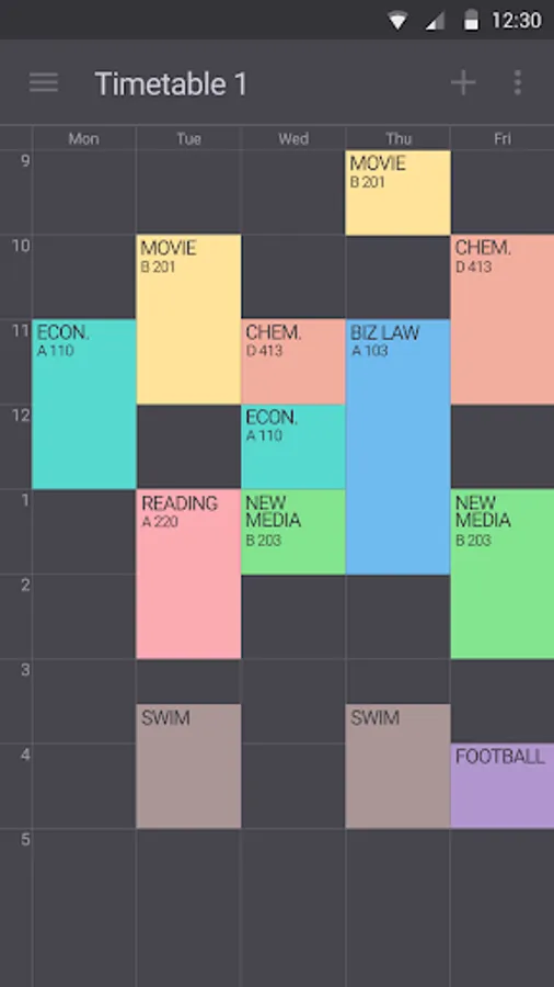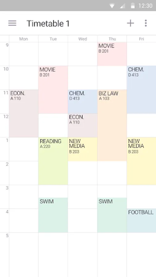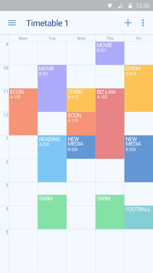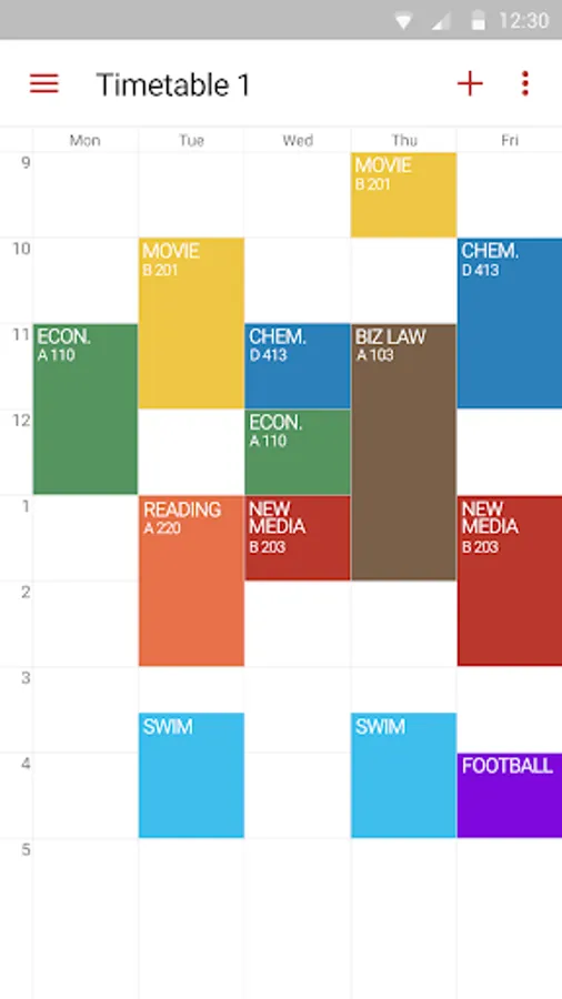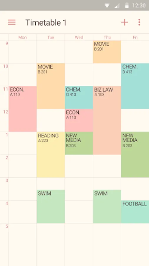 Timetable provides 6 colorful themes and different options - text size, displayed info, first day, start time and etc. Choose one of them and customize its appearance or features to suit your tastes or needs.