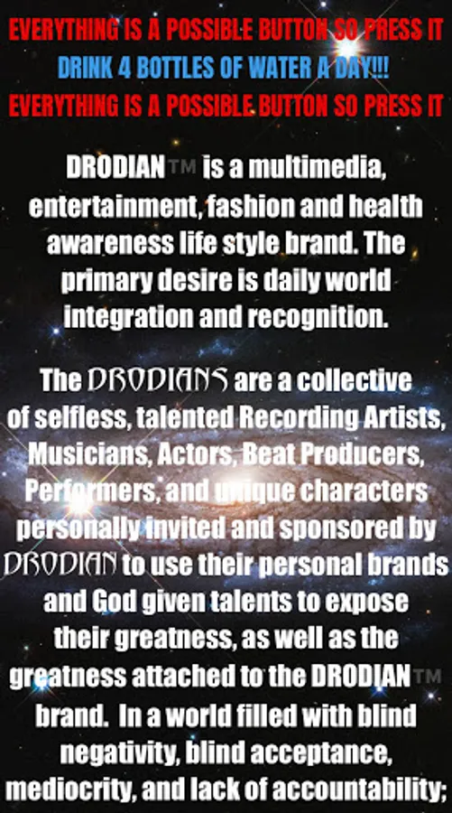 DRODIANS are the are a collective of talented Recording Artists, Musicians, Actors, Beat Producers, Performers, and unique characters personally invited and sponsored by DRODIAN to use their personal brands and God given talents to expose their greatness, as well as the greatness attached to the DRODIAN™ brand.