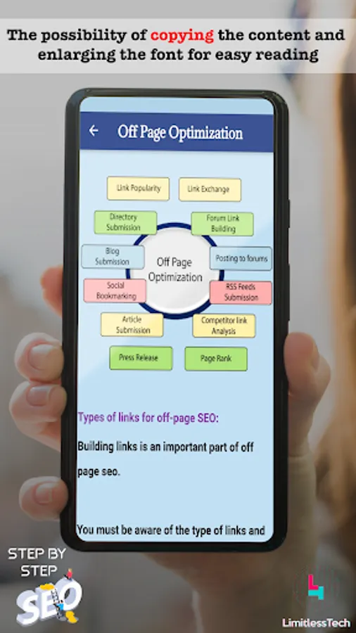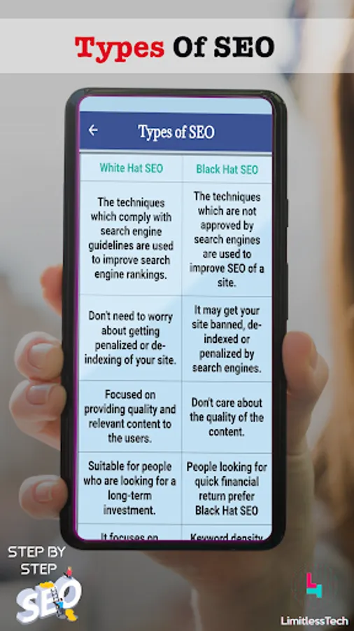 SEO Step by Step: Everything related to the SEO you will find in the application explained in detail and clearly, the lessons have been divided into several sections for ease of access and the most important sections: