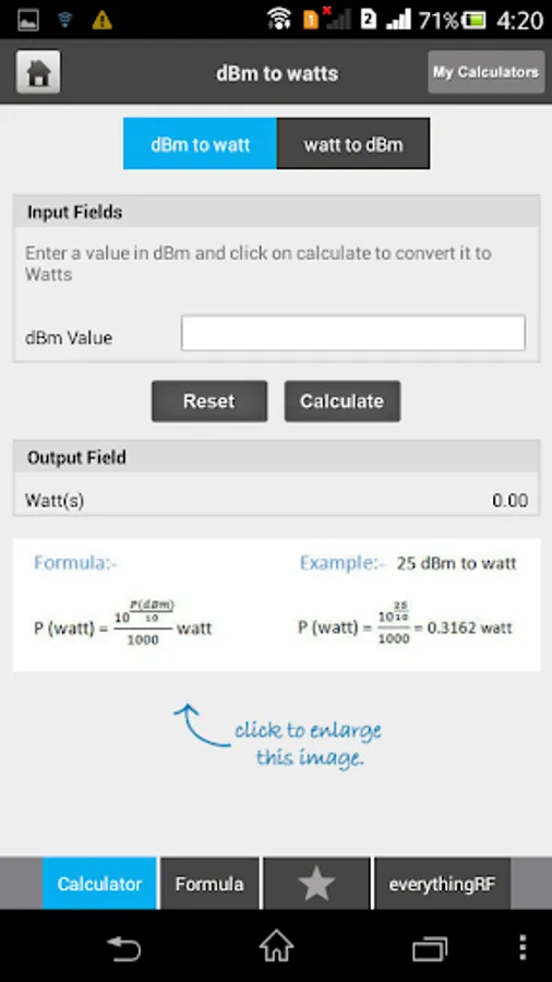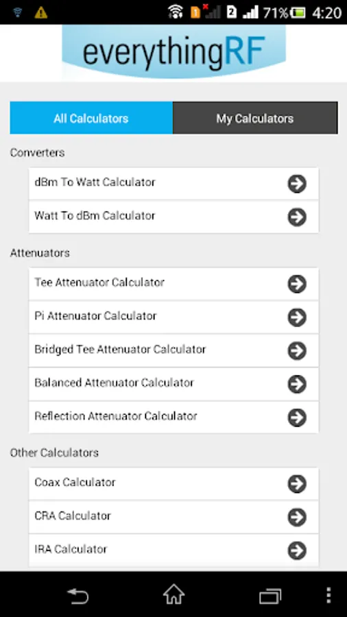 Do all your RF calculations using this application. Here is a list of some of the calculators in this app: