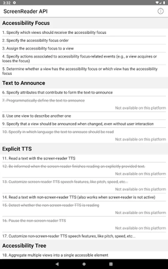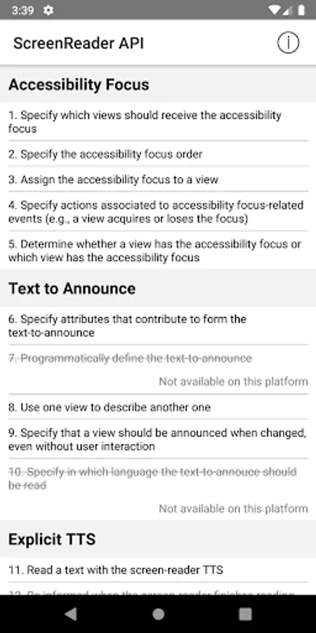 This app is for developers only. It shows which screen-reader-related APIs can be used when developing in React Native. The app was developed in React Native. Documentation and source code is available from the project web page: https://everywarelab.di.unimi.it/15-research-projects/211-at-in-programming-languages