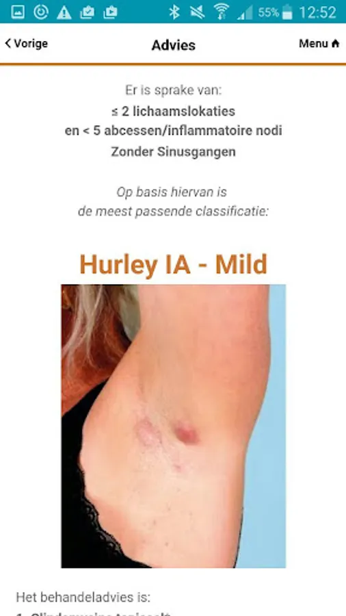 Hidradenitis suppurativa (HS) is an inflammatory skin disease that has many phenotypes. In daily practice, the Hurley stages are frequently used to classify HS. A major shortcoming of the 'classic Hurley classification "is not included the inflammatory component and the extent of HS. For these reasons, the Working Group HS an aside nuances recently made to the 'classic Hurley classification. The nuances, this "sophisticated Hurley classification" the ability to characterize the different phenotypes HS nauwkeurigte. In addition, the working group on the basis of the 'refined Hurley classification' a treatment algorithm developed based on recent guidelines. The handy app allows the 'refined Hurley classification "by applying the appropriate treatment algorithm in daily practice.