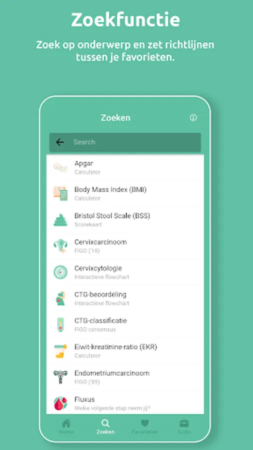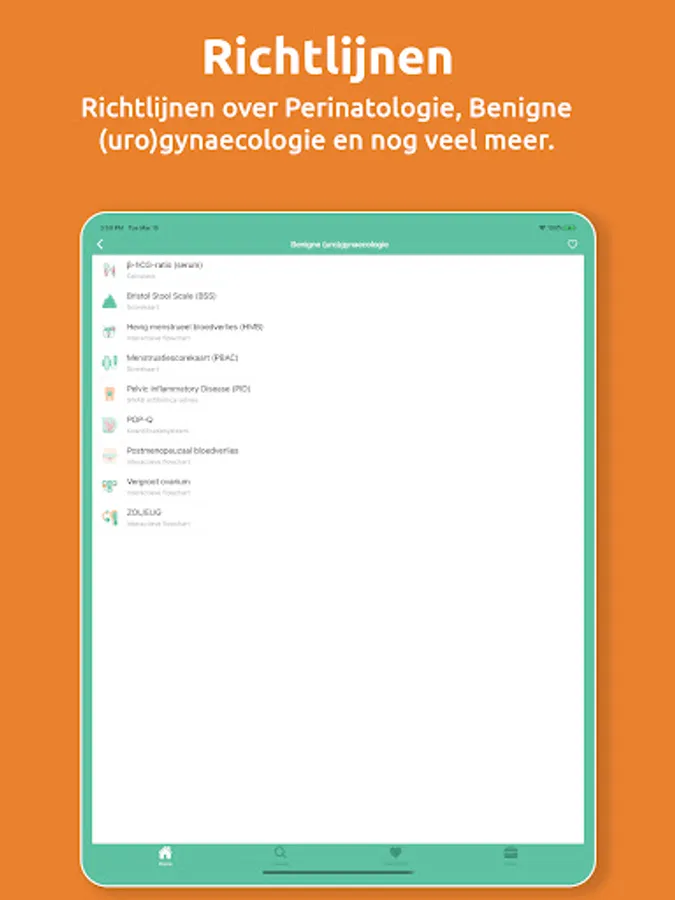 The 'Gyn app' is intended for all healthcare providers involved in the care of patients within gynaecology and obstetrics. It contains interpretations of guidelines, including interactive flow charts and handy calculators, which can also be saved as a 'favorite'.